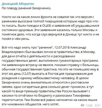 Як повідомили в Telegram-співтоваристві «Донецький Абориген», фейк про поранення створений піарниками Захарченко, щоб той зміг уникнути поїздки в Москву «на килим».